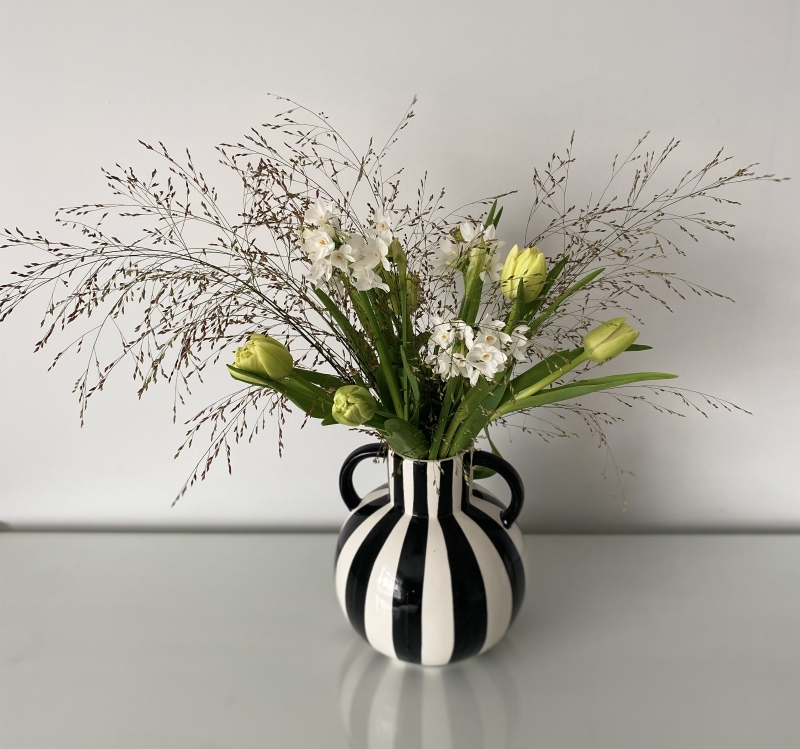 A trendy white and black, stripy ceramic vase with white spring flowers.